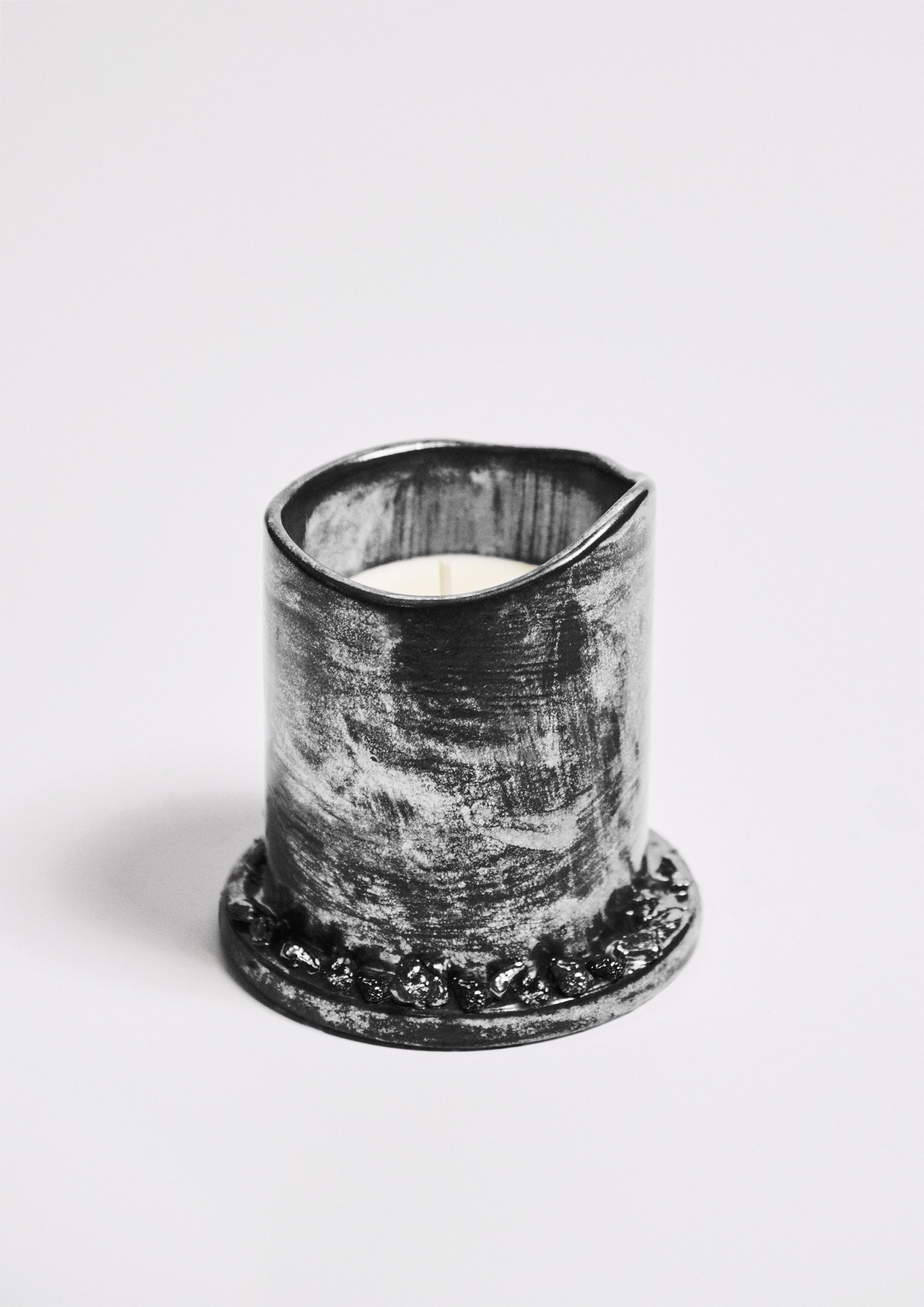 Candela in vaso di ceramica artigianale, smaltato in argento con logo inciso sul fondo.