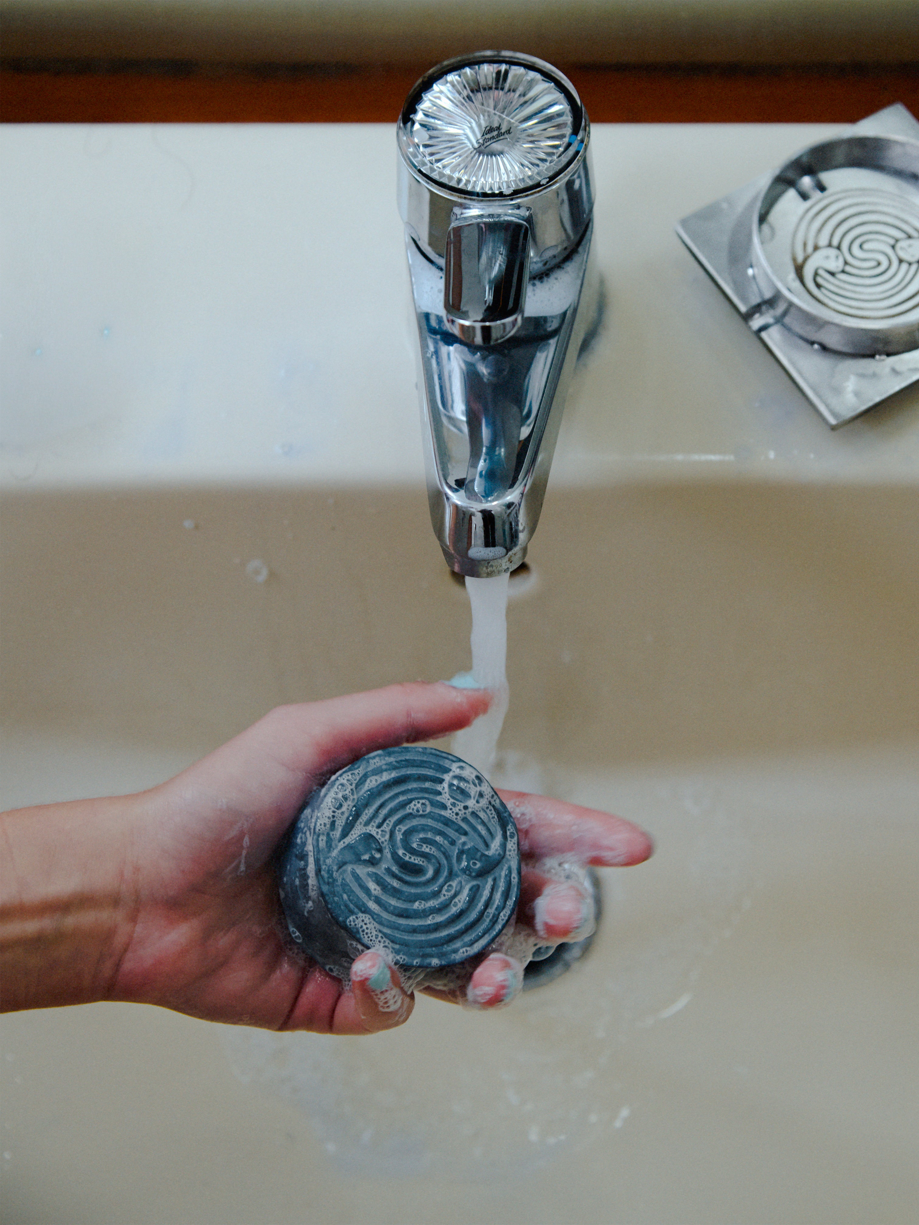 Inumidire il sapone con acqua e massaggiarlo tra le mani o direttamente sulla pelle per ottenere una soffice schiuma bianca. Il carbone vegetale contenuto non altera il colore della schiuma.